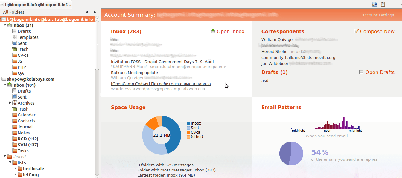 Най-интересна за ,мен е частта с това, коя папка, каква част от паметта ми заема, както и интересната статитика за отговорените мейли :)